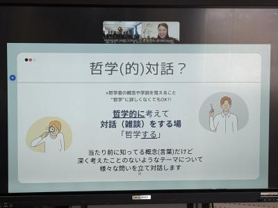 【受講生徒の感想】私が哲学対話を通して学び、気づいたことは2つあります。1つ目は、主観的・客観的な考えや見方を大切に出来るようになったことです。この哲学対話の場では、何が正解で何が不正解という決まりは無く、全ての意見や思考を大切にしながら対話をしていきます。そのため、私は多くの人の考え方に耳を傾けることが出来ましまた。2つ目は、考えることの楽しさを知れたことです。哲学対話は、考えることでたくさんの意見が生まれ、考えを深めることができます。考えるということは、頭の中を様々な思考が飛び交い、頭が疲れてしまう時もありますが、それ以上に一人でも複数人でも考えることの楽しさを知ることが出来ました。私は、今回で3回目の参加でした。初めて参加した時は、とても緊張していて、自分の意見を相手にわかりやすく伝えることばかり気にしていてとても不安でした。しかし、今はその場の優しさに包まれた話しやすい雰囲気のおかげで安心して自分の意見を話し、楽しみながら相手の意見を聞くことが出来るようになりました。本当に哲学対話という私の居場所に出会えて良かったと思っています。