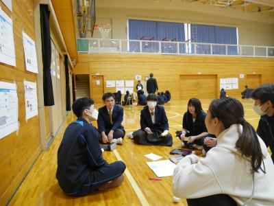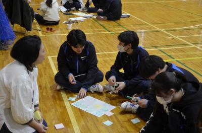 最初は緊張していた生徒たち。今回は机を挟んで向き合うのではなく、ポスターを前にみんなで輪になって座る「車座(くるまざ)」のスタイルで行いました。